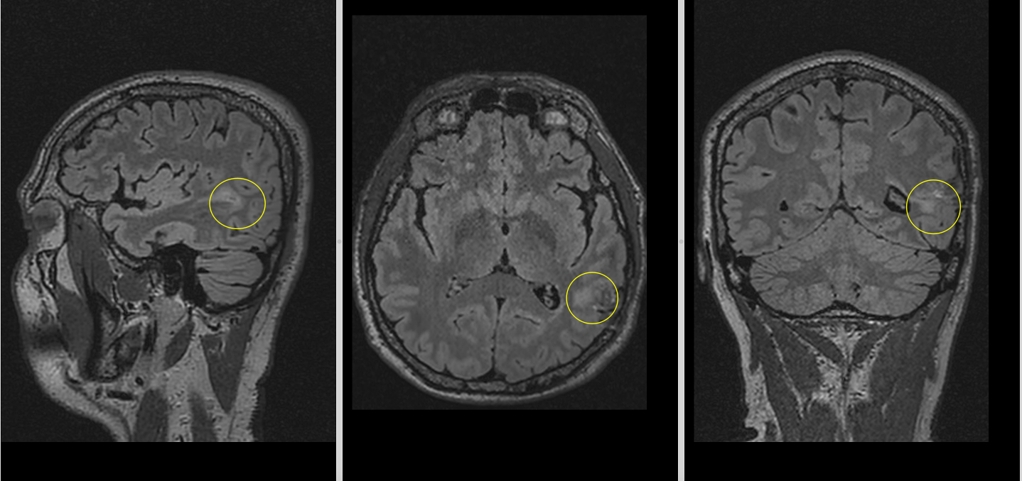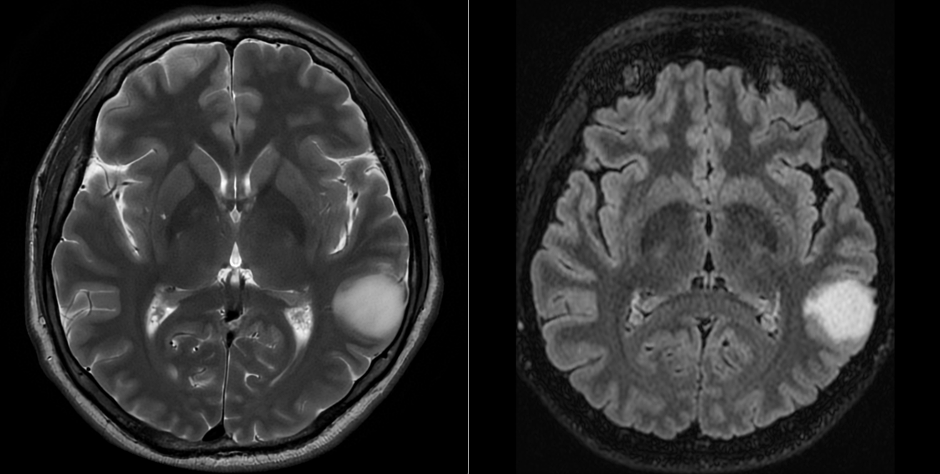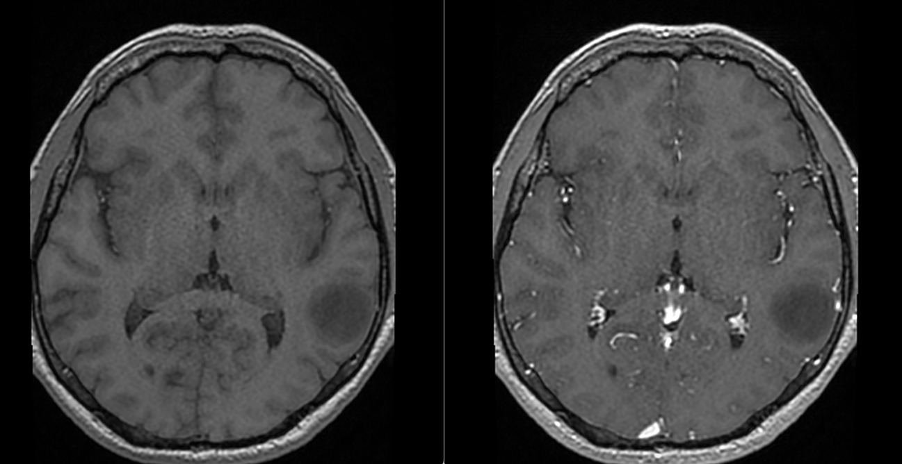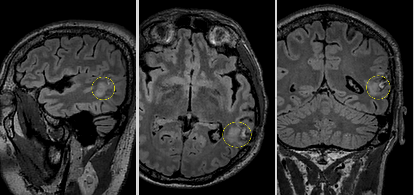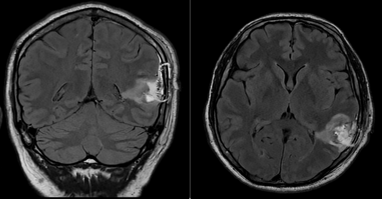 RMN-ul cerebral a evidențiat o tumoră temporală stângă cu semnal hiperintens în secvențele T2 și FLAIR, hiposemnal T1 și fără priză de contrast — un profil imagistic sugestiv pentru un gliom de grad mic.