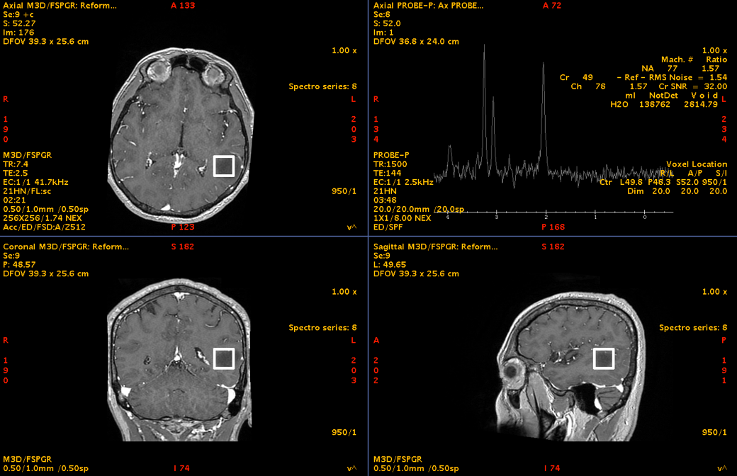 Spectroscopia RMN a susținut caracterul de proliferare tumorală glială, deși, așa cum se întâmplă frecvent în aceste leziuni, diagnosticul de certitudine nu putea fi stabilit doar imagistic, ci necesita confirmare histopatologică.