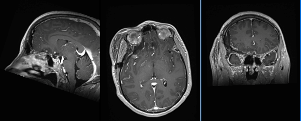 Pacientă tânără, în vârstă de 50 ani, diagnosticată în urmă cu 3 ani cu o tumoră de bază de craniu – etaj anterior, cu evoluție progresivă: de la 2 cm diametru în 2019 la 3 cm diametru în februarie 2023.