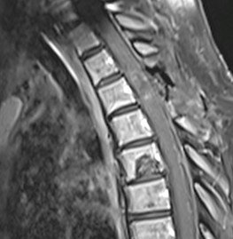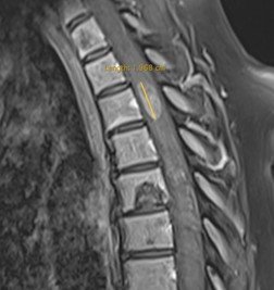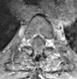 Pacientă în vârstă de 54 ani, cu un istoric îndelungat de neoplasm mamar, care acuză scăderea forței musculare în membrul inferior drept. RMN de coloană toracală a evidențiat o tumoră intramedulară T3-T4 de cca. 20/9/8 mm, centrală, relativ bine delimitată, care captează substanța de contrast – aspect sugestiv pentru o determinare secundară (metastază).